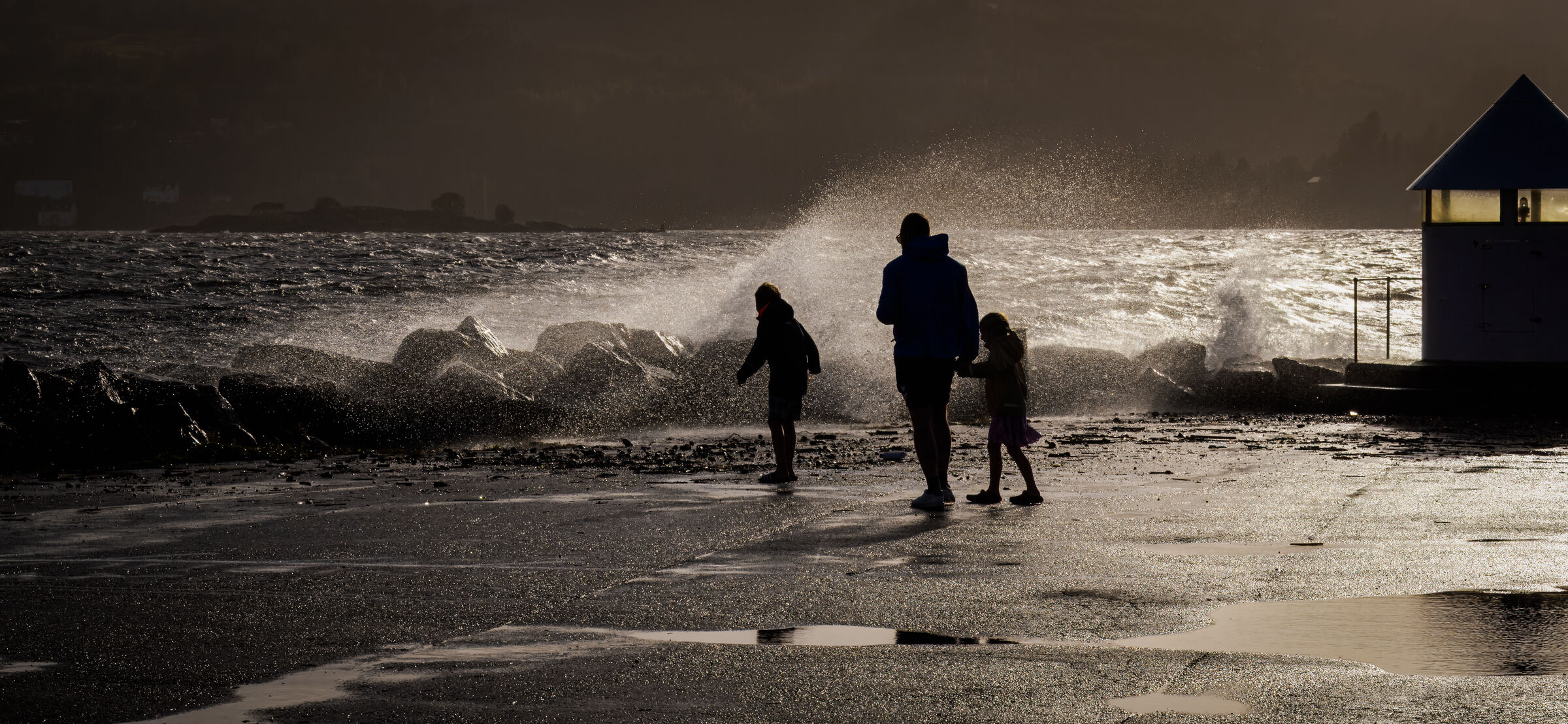 Fint værbilde. Er litt usikker på om fyrlykten tilfører bildet noe. Tror kanskje det vil bli bedre om fyrlykten ble tatt bort slik at personene kom litt mere til høyre i bildet. Fint bilde og her er menneskene virkelig i været. Men det er sørgelig at fyrlykten ikke er helt med. Jeg ville nok heller beskåret bilde så det amputerte fyret ikke ble med. Flott med menneseker i stormen! Fyrlykta til høyre kan godt skjæres vekk for bedre konsentrasjon av hovedmotivet.