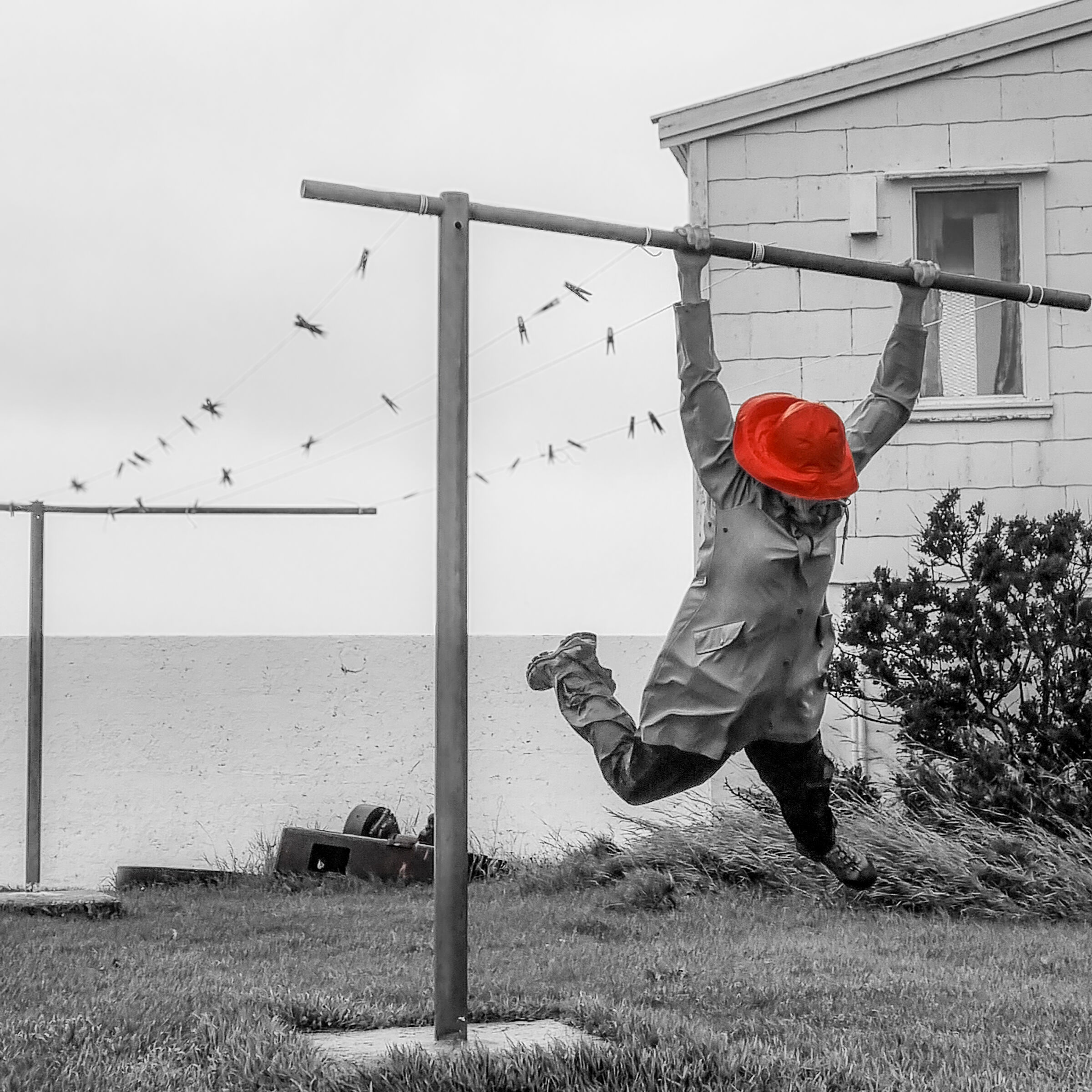 K Her blåser det! Morsomt motiv med rød sydvest i det gyldne snitt... Tight og god komposisjon.