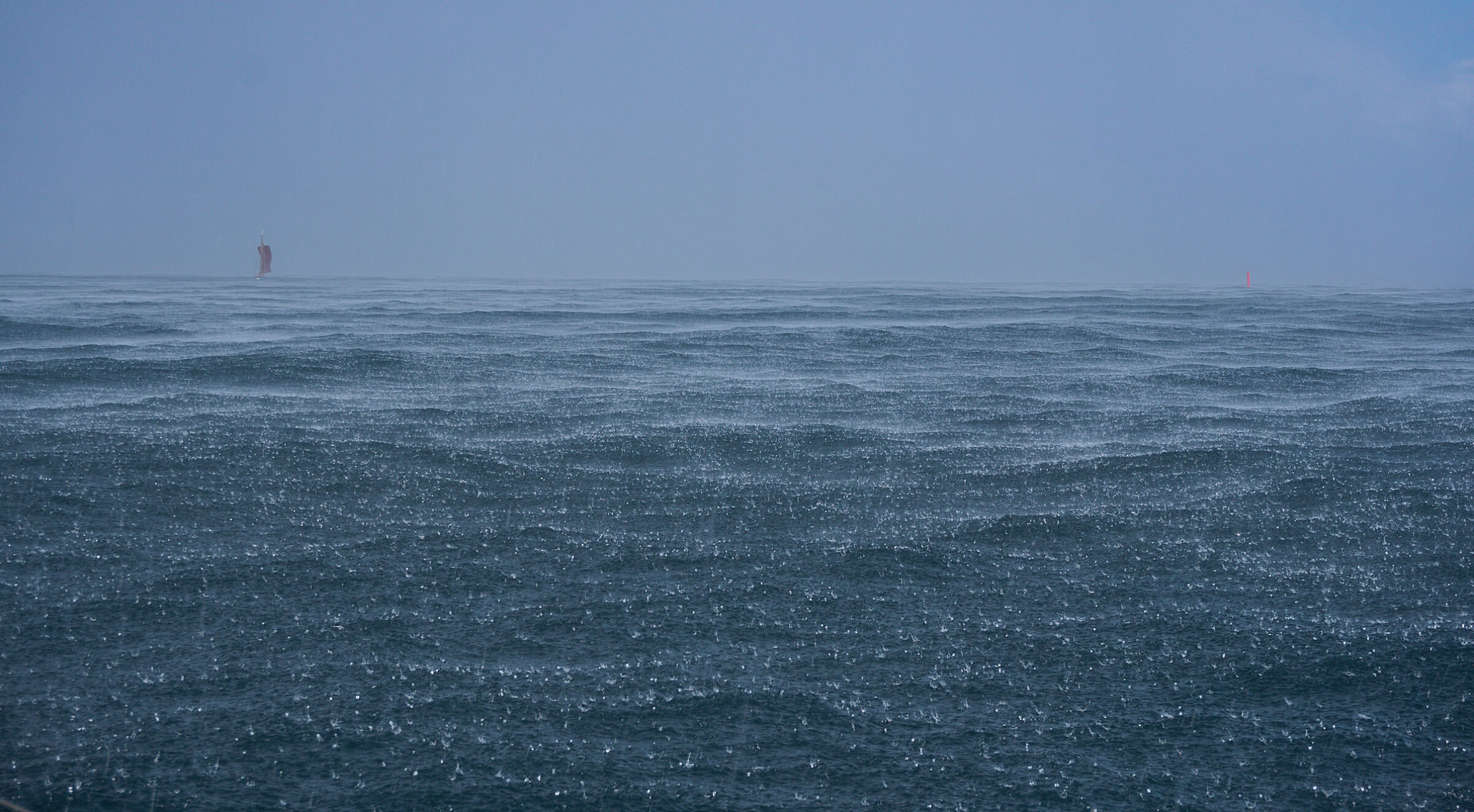 Den lille båten i været. Det røde seilet og den røde bøyen gir fin balanse og man godt forestille seg hvor vått alt er. Bildet er dessverre skeivt og det trekker ned.