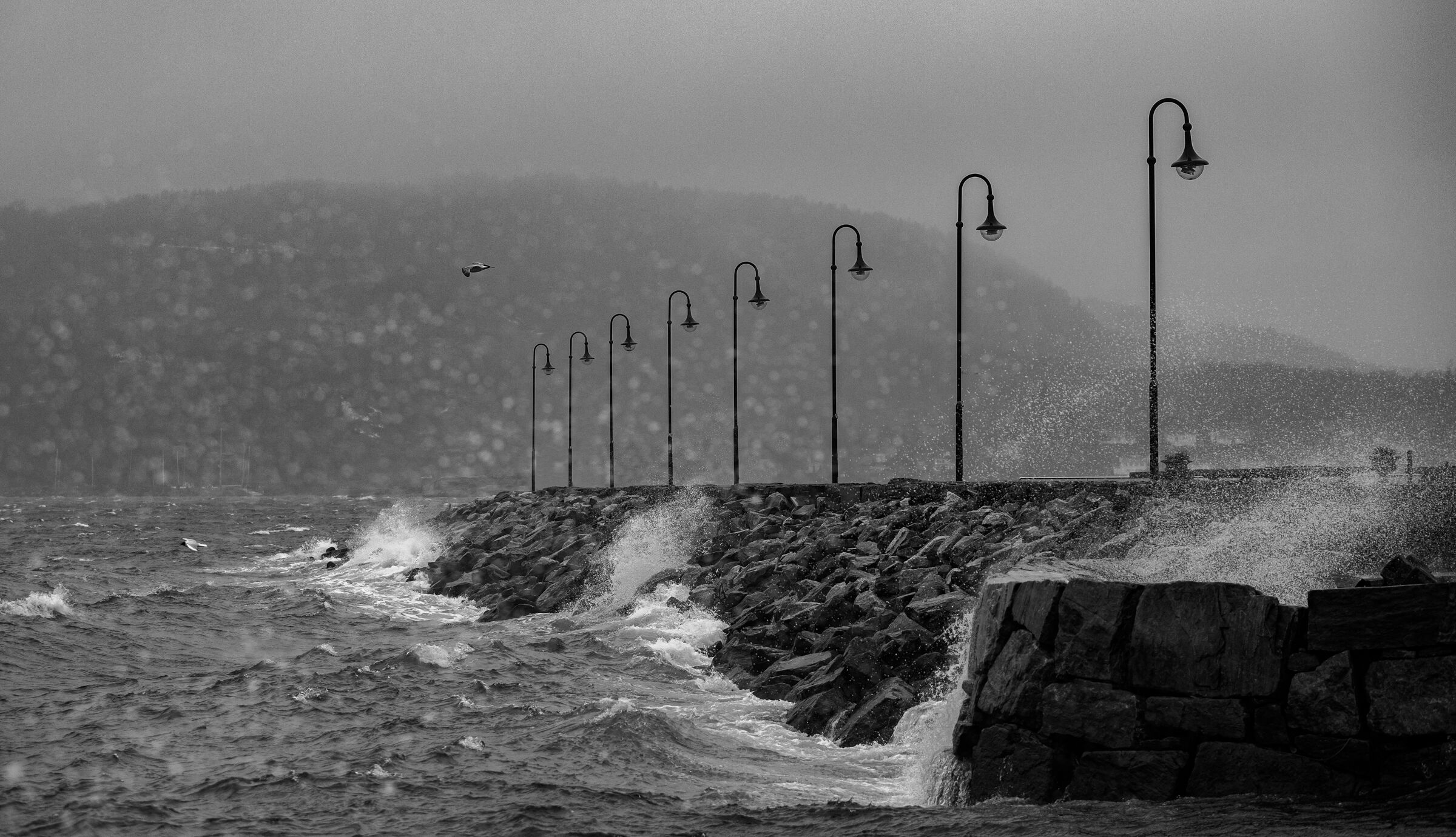 Fint med den rytmiske repeteringen av stolpene, men været og vinden ble litt svakt. Her er været også følbart, fint med rekken av lyktestolper som gir fin dybde i fotografiet. Passer godt i svart-hvitt. Fuglen blir prikken over ien! Et bilde som passer bra til motivet. En fin komposisjon og bra sh-teknikk.