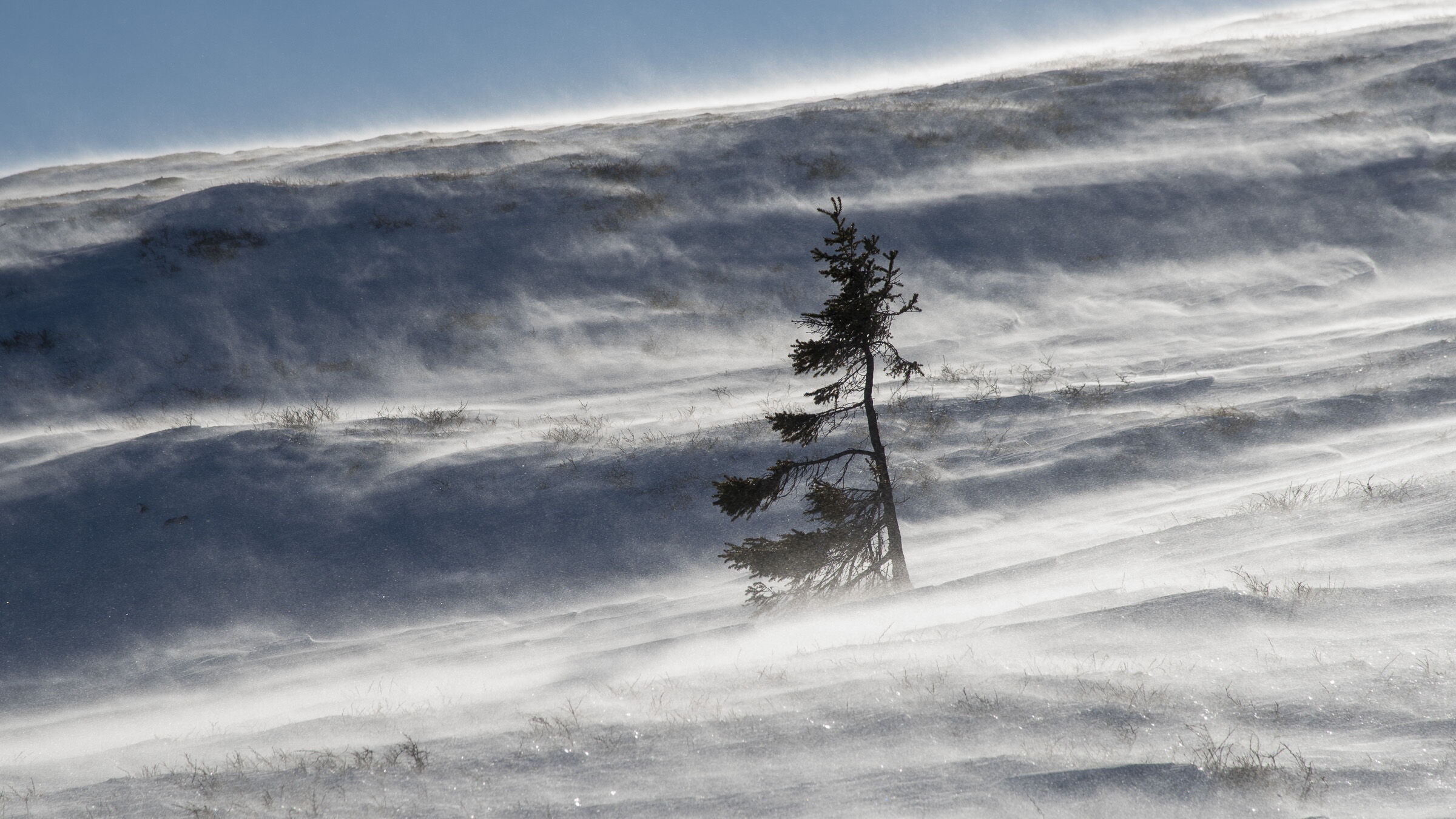 K Fin beskrivelse, her er det vær og vind! Men treet (bildet) burde rettes opp til loddfrett posisjon. Nå virker bildet skjevt. K Fint bilde som passer fint til temaet. Ville ha beskåret bilde litt på høyre side.