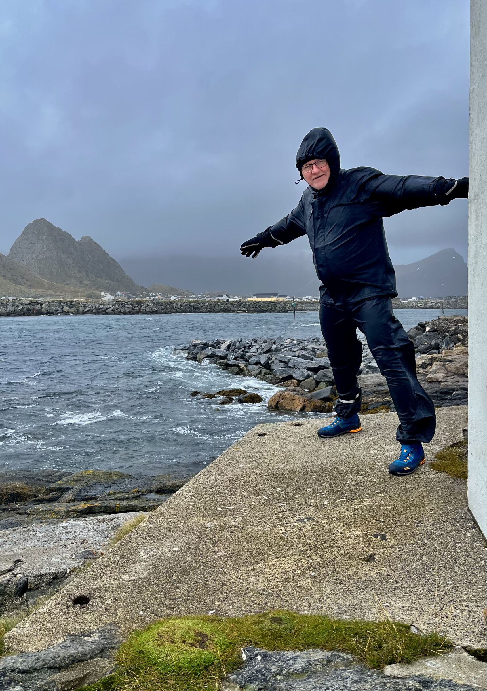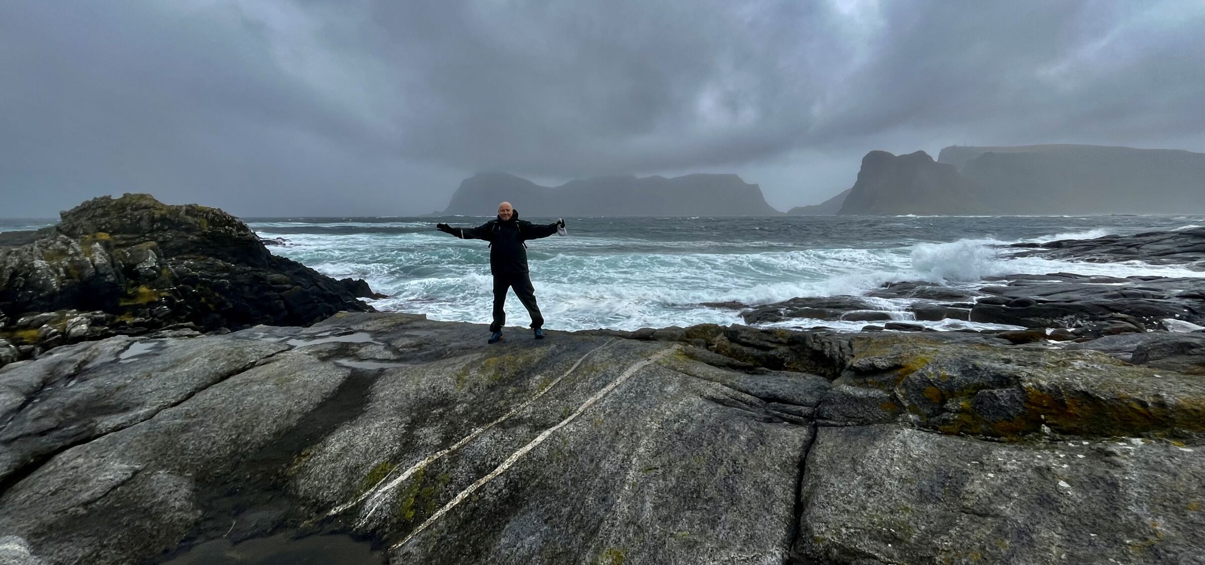 Mann i vær - ja, så absolutt. Jeg tror nok kanskje jeg ville satt mannen ned på svaberget med ryggen mot oss. Slik det er nå tar han for mye fokus bort fra været. Fint med menneske i tøff natur! (Kanskje en forsiktig (1/4) beskjæring inn fra venstre ville gjort det bedre?)